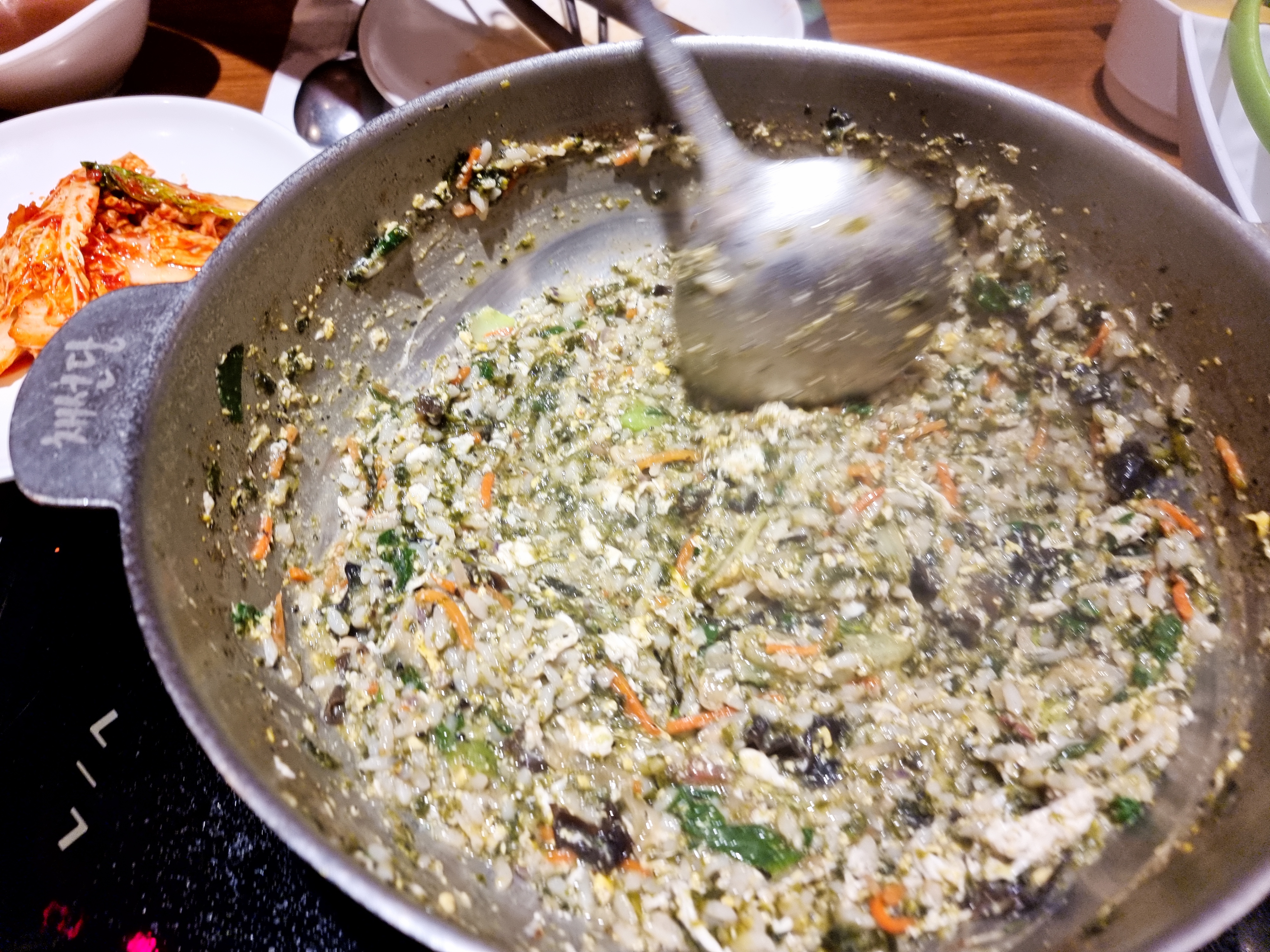 그 육수에 밥과 김가루 계란 등을 넣어